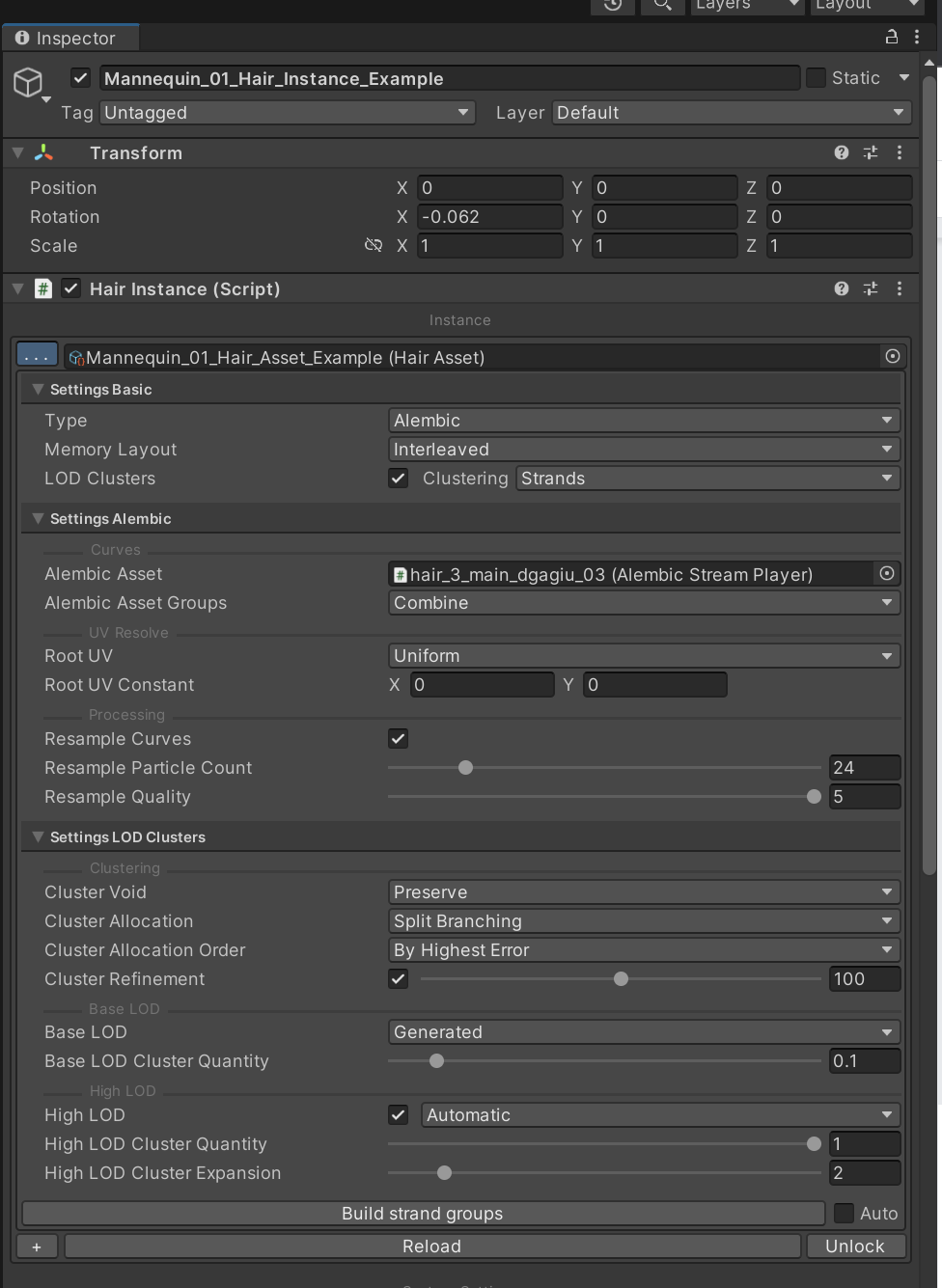 - It can be practical to iterate on asset parameters from the hair instance. For example, you might adjust Resample Curves to rebuild the asset with a larger or smaller number of particles, depending on the simulation results when you tweak the LOD Clusters settings.