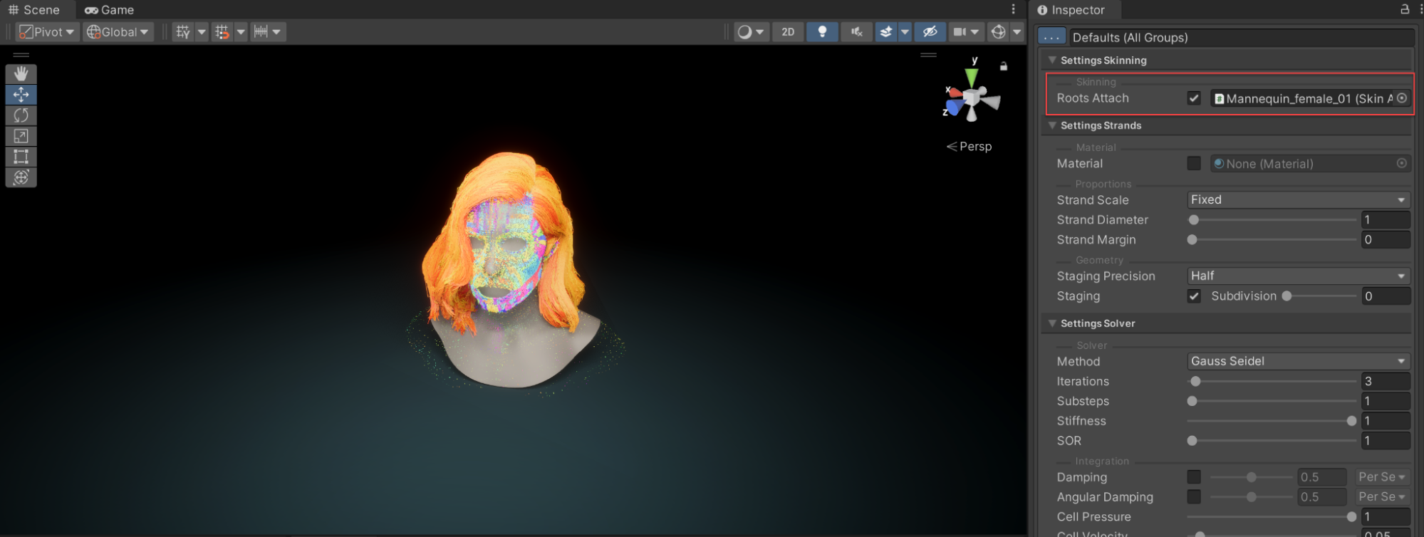 6. Now enable Roots Attach (Inspector > Strand Settings > Settings Skinning) and select the mesh that contains the Skin Attachment Target mesh. When you attach a hair instance, your attachment data will automatically regenerate. Your groom should follow your deforming mesh as it moves.