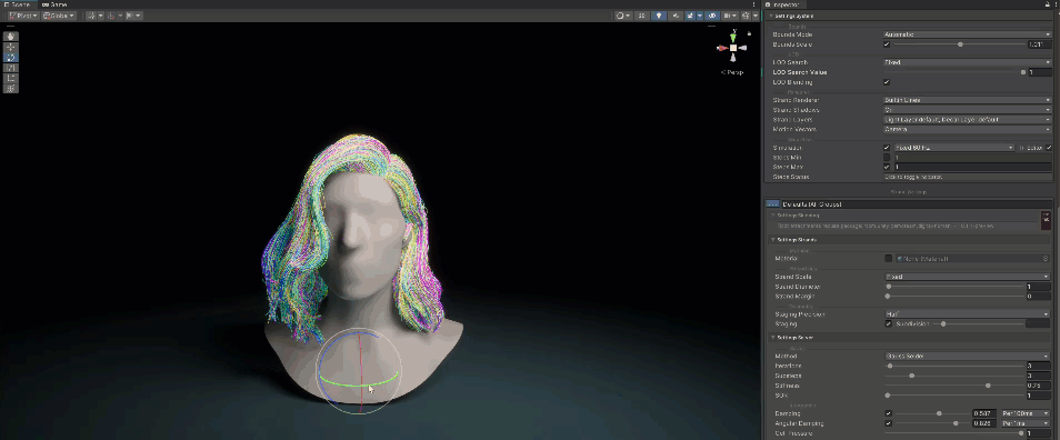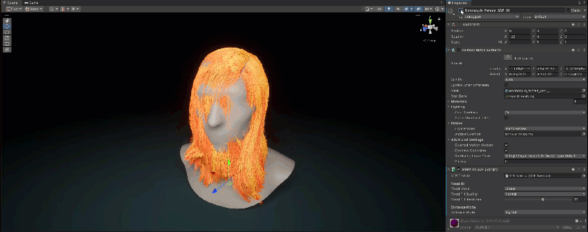 3. To determine if the setup is working, enable and disable the GameObject that has the MeshToSDF component; the hair should pop out of the geometry when you enable the GameObject.