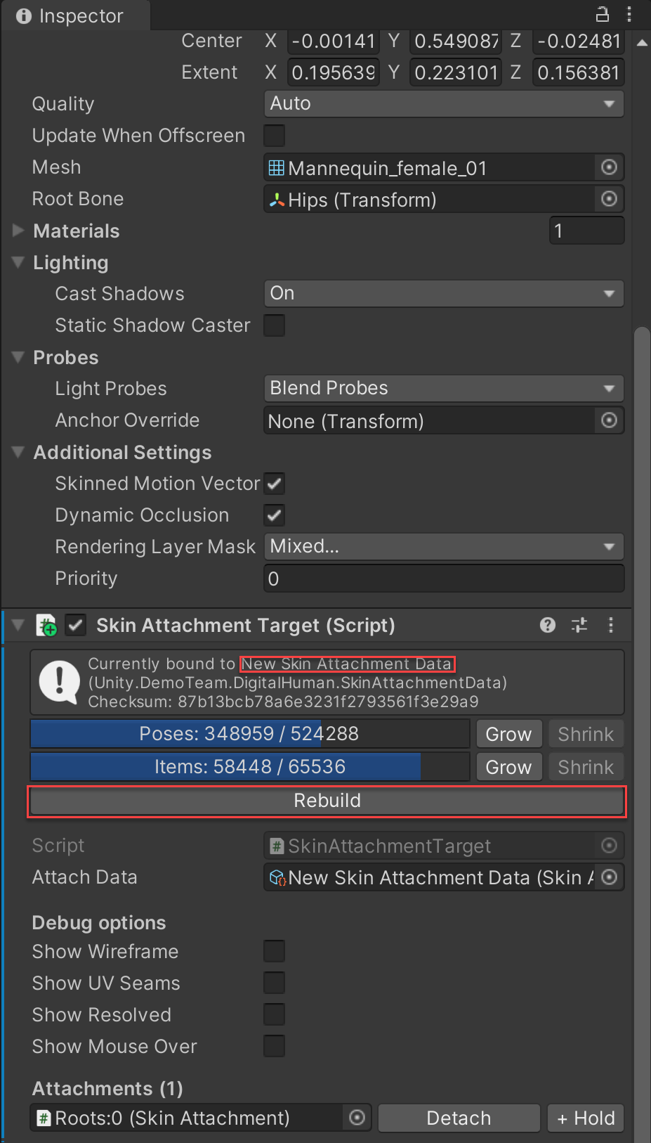 4. Add the Skin Attachment Target component to the Character Mesh, and populate the Attach Data property with Skin Attachment Data. This component deforms any attachments together with the skin. If you need to rebuild the attachment data (for example, if you add or change some attachments that the system is supposed to drive), select Rebuild. The hair system automatically regenerates this data.