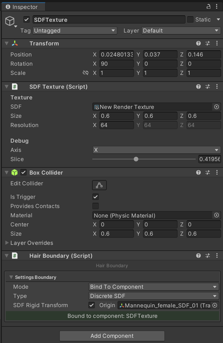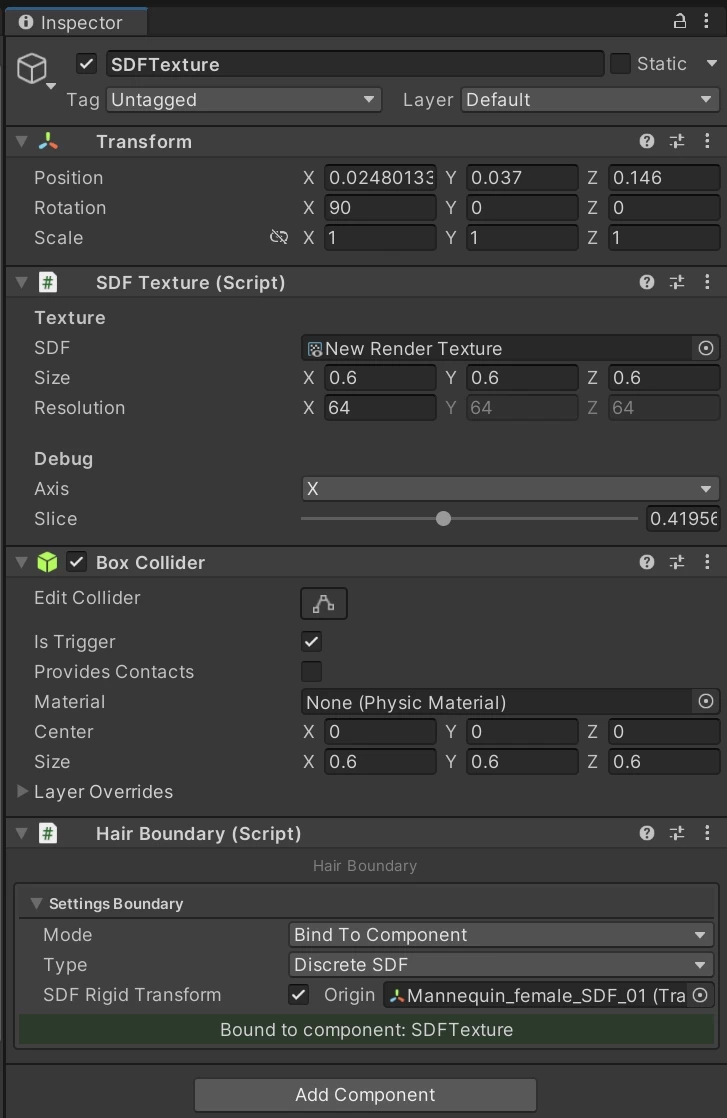 1. Add a Box Collider component and enable Is Trigger. This allows the hair instance to efficiently collect relevant hair boundaries from the scene with the aid of the physics system. The Box Collider's dimensions should closely match the size of the SDF.