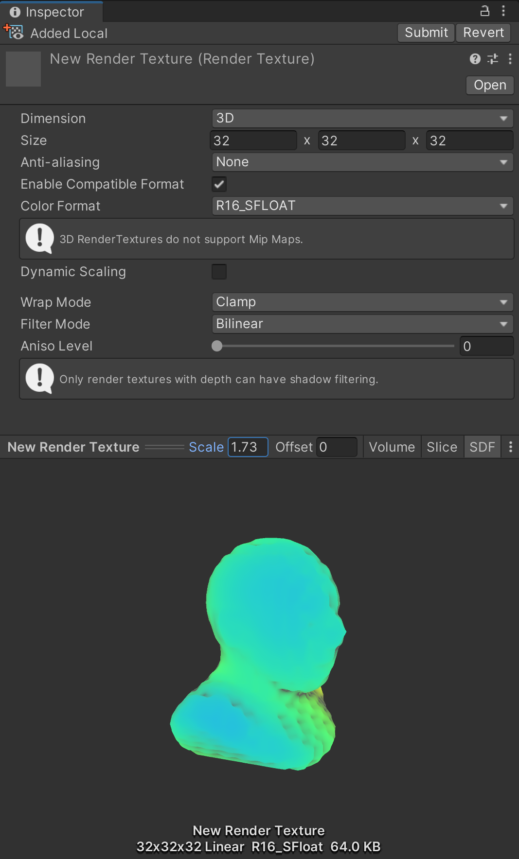 To preview the SDF, either select the SDFTexture GameObject in the Scene view or select the 3D render texture asset and use one of the 3D texture preview modes in the Inspector. If you use the 3D texture preview mode, adjust your scale appropriately.