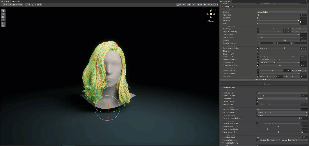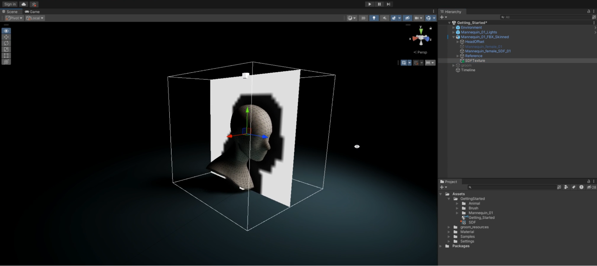 7. To determine if the setup is working, you can enable and disable the Game Object that has the MeshToSDF Component and the hair should pop out of the geometry when you enable the Game Object.