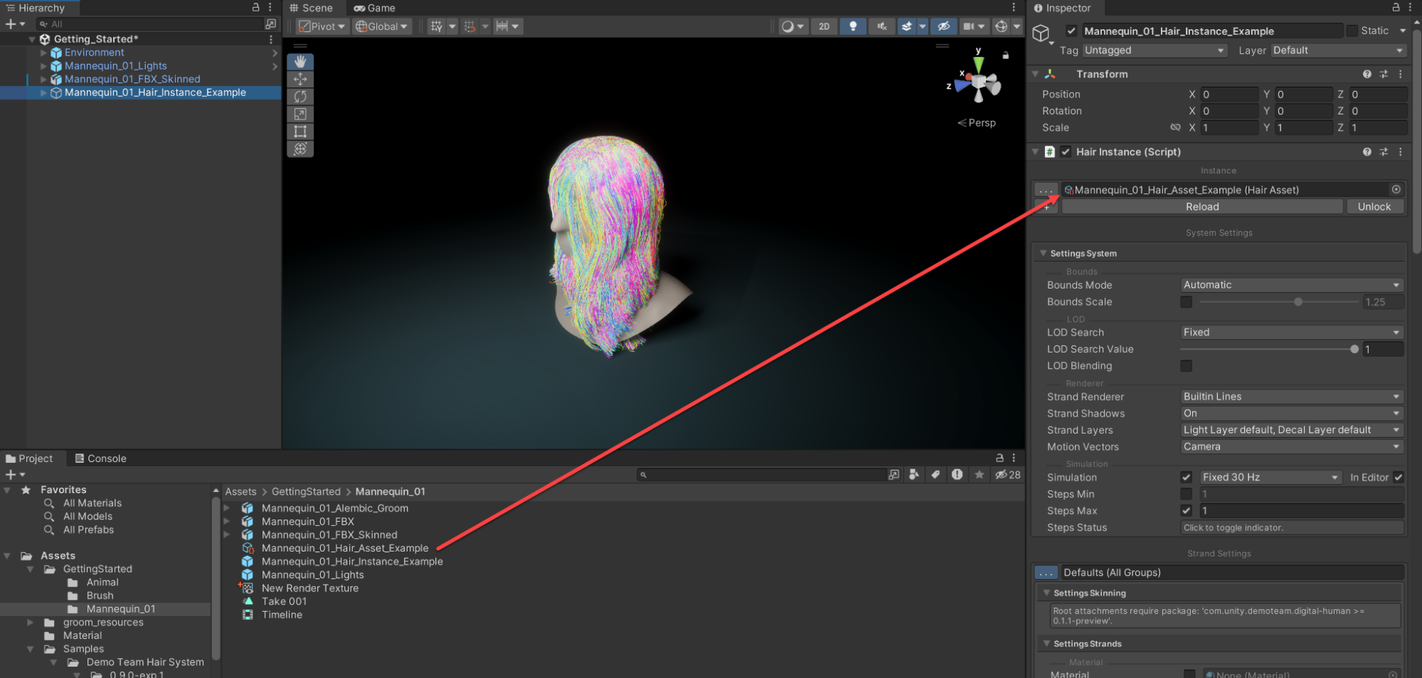 2. Add a Hair Instance component to the empty GameObject (Mannequin_01 in the screenshots).
