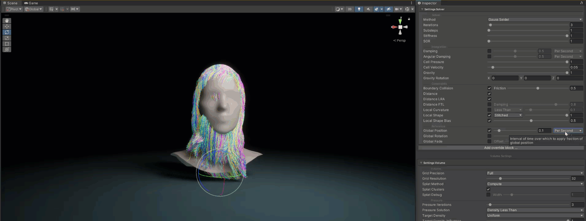 - You might want to adjust the Solver settings. Enable Global Position and apply a long time interval to a low Global Position value. A Global Position value of 1 fully reproduces the Alembic groom, and no simulation occurs. For this reason, it is best practice to start iterating with a very low Global Position value.