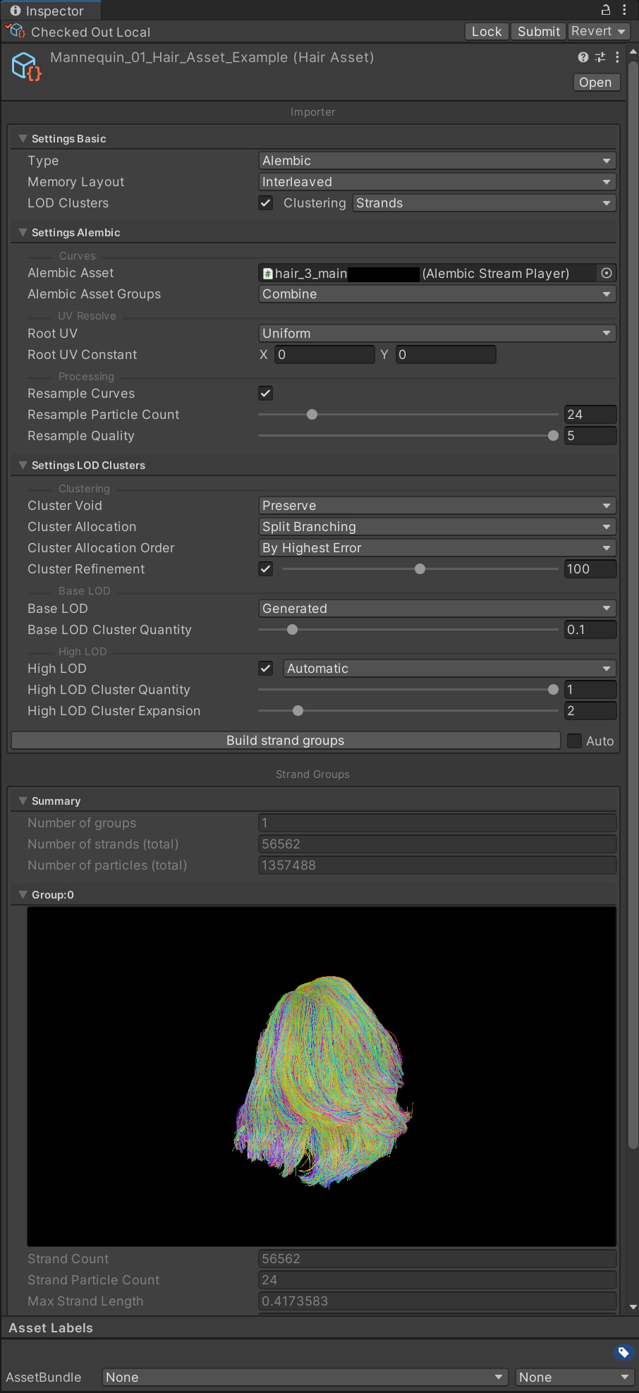 4. Drag an Alembic file over the hair asset in the Project window, and drop it there to assign the Alembic file to the hair asset.