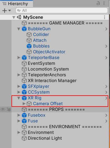 1. In the Hierarchy, select the grey arrow to the left of the XR Rig GameObject to expand its child GameObjects.