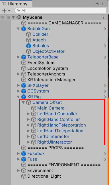 2. Select the arrow to the left of the Camera Offset GameObject to expand its child GameObjects.