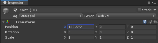 Select each planet one by one and using also the inspector (make sure you select the root (IO) object) set their X positions accordingly. For the tutorial we have scaled down distances as follows:
