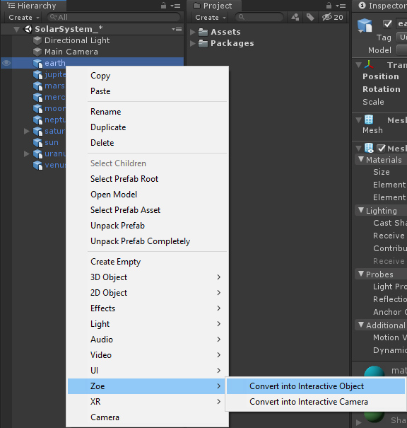 So before we continue with the placement select each planet, the sun and the moon, one by one and right-click in the Hierarchy and select Zoe > Convert Into Interactive Object.