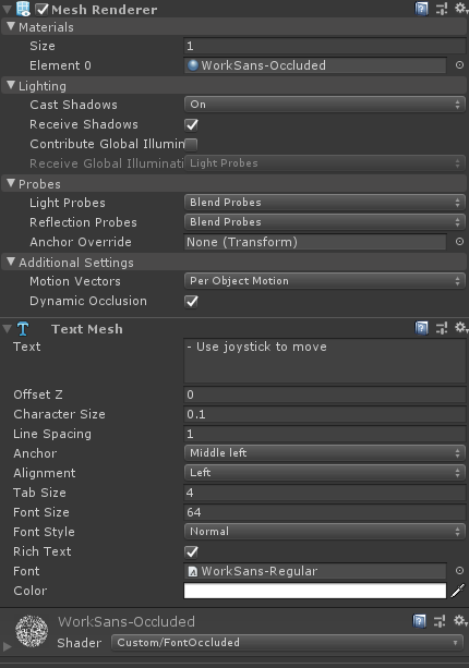 Right-click in an empty space of the Hierarchy and go to 3D Object > 3D Text. A big ‘Hello World’ text appears. In the Inspector, inside the text box, write the first instruction: “- Use joystick to move”.
