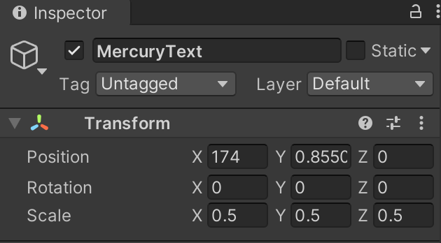 Now we are also going to add some information about planets. Use the 3D Text again and create a text above Mercury, for example: “Mercury is the smallest planet with a diameter of 4900 km.”