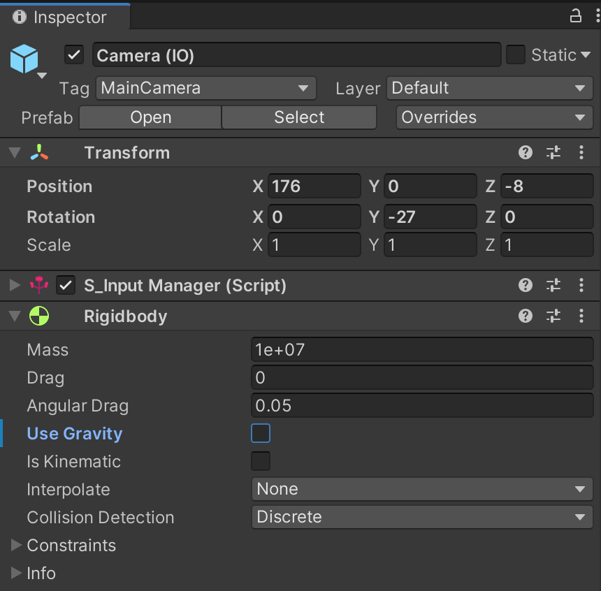 Before testing in your headset you need to deactivate the gravity of the camera otherwise you will fall endlessly because there is no ground to hold you. For this, select again the Camera (IO), in the Inspector under the Rigidbody component uncheck the "Use Gravity" option: