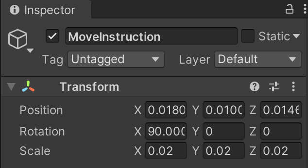 Resize the text: leaving the Font size at 64 for a good resolution, adapt the Scale of the Transform to 0.02.Then rotate it 90° on X so it is aligned with the controller and use the Move Tool (arrows) in your Scene view to place it next to the controllers.