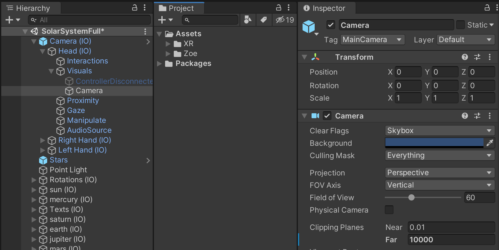 Now, as we are going to work with large distances we need to increase the distance the camera is able to see. For this, go to Camera (IO) > Head(IO) > Visuals and select the actual Camera object. In the Inspector, under "Clipping Planes", change the 'Far' value to a bigger one, for example 10000. You can also change the 'Near' value to 0.1