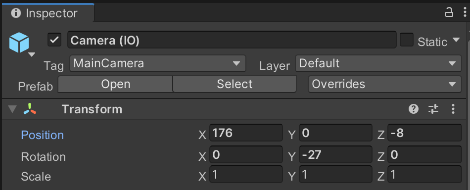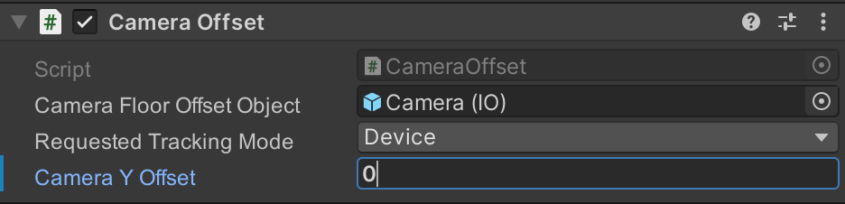 The important thing is for the Camera to stay at 0 in height so it is at the same level as the planets. If you 'Play' the experience now you would see the Camera going back to a height of 1.7m. This is because there is a system that automatically sets the Camera height to 1.7m. To bypass this you need to change the value inside another script. Inside the same Inspector window from the Camera(IO) go down to the 'Camera Offset' script. Change 'Camera Y Offset' value to 0.