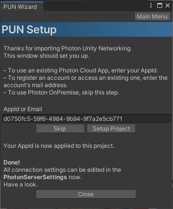 4. Enter your e-mail address or an existing AppId. Click Setup Project (Figure 03). The PhotonServerSettings Asset is updated and you’re ready to get started with PUN.