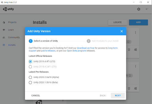 2. Install the Unity Version 2019.4.4f1 (LTS) (Figure 1)