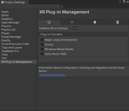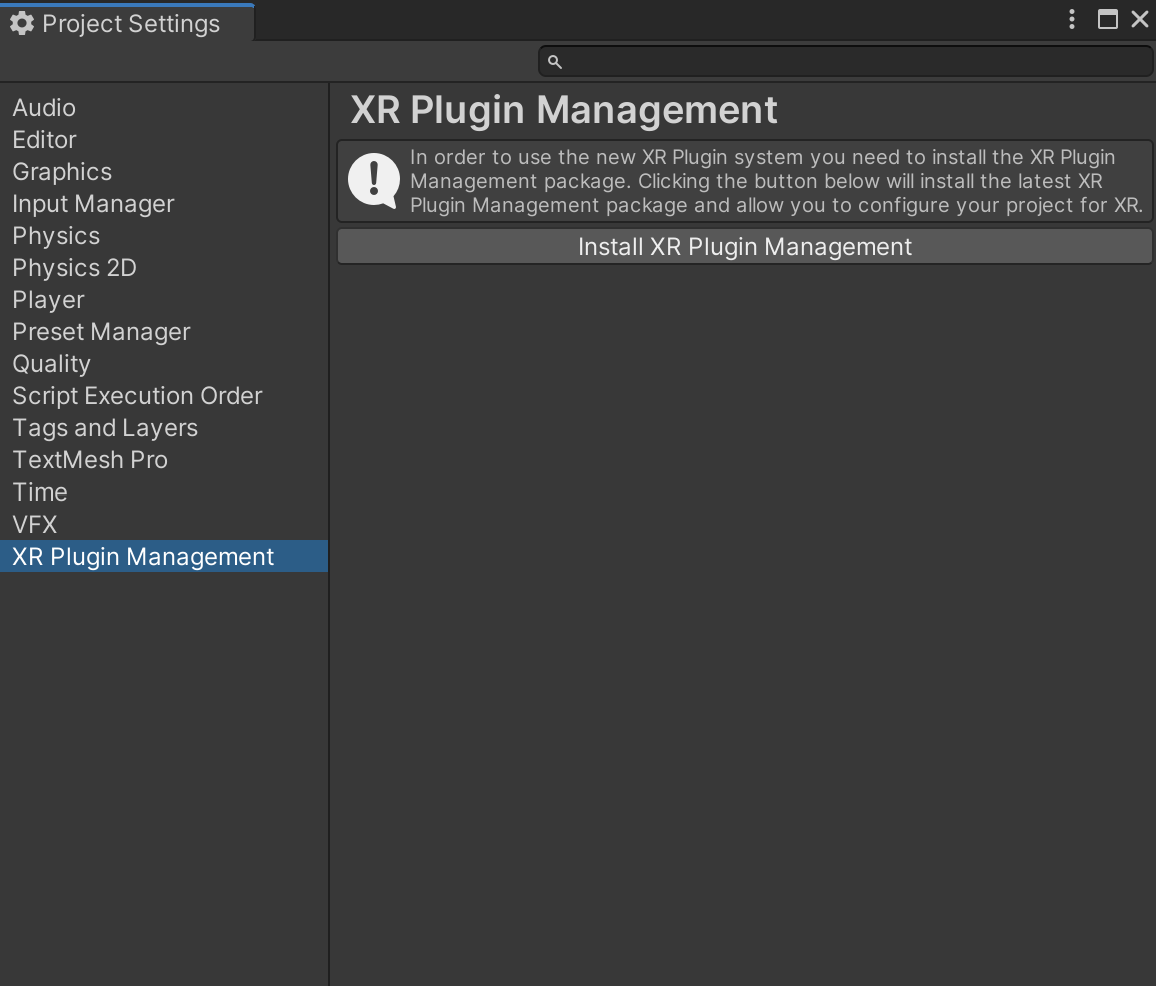 2. Inside the Project Settings window, find and select the XR Plugin Management tab