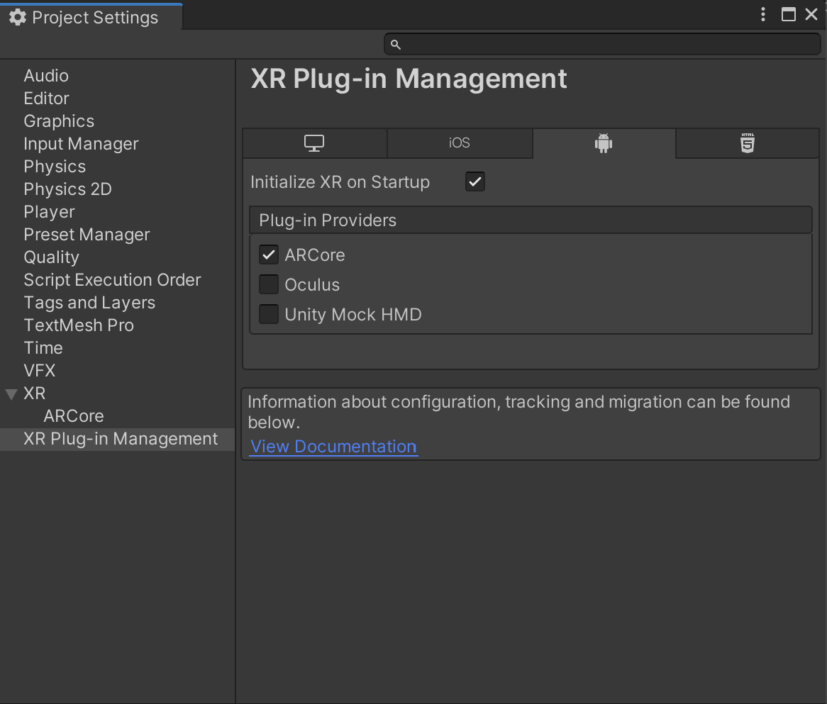 5. Click the tab for Android and check the box for ARCore (Figure 9)
