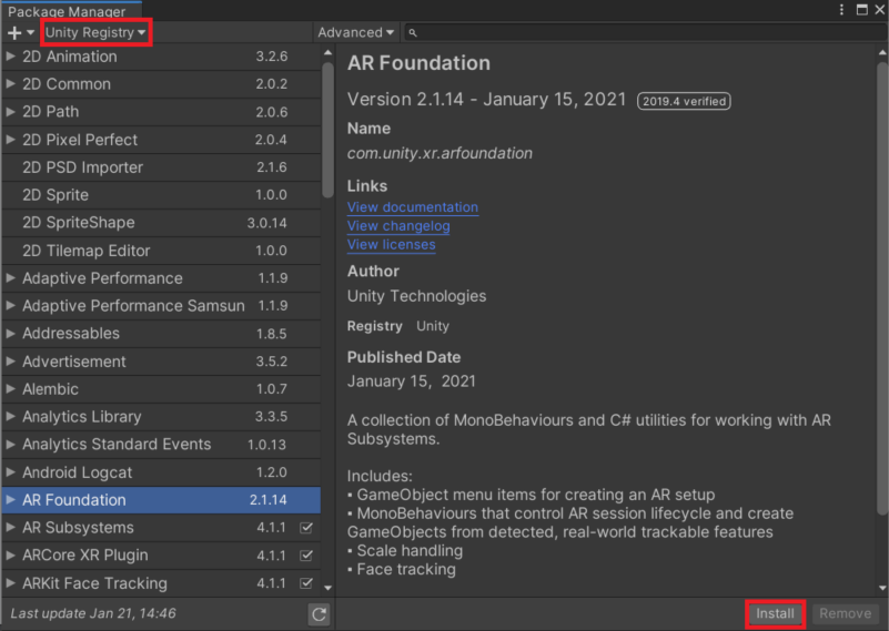 7. In the Unity Registry, find the AR Foundation package and click Install (Figure 10)