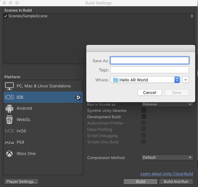 3. Enter a name for the Build. In this case, “HelloARWorld” is entered
