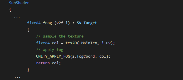 6. Navigate into the SubShader block then to the fixed4 frag function. The frag function is responsible for calculating the final color output of our Shader (Figure 09).