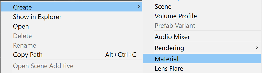 1. Right-click in the Project window and navigate to Create > Material (Figure 02).