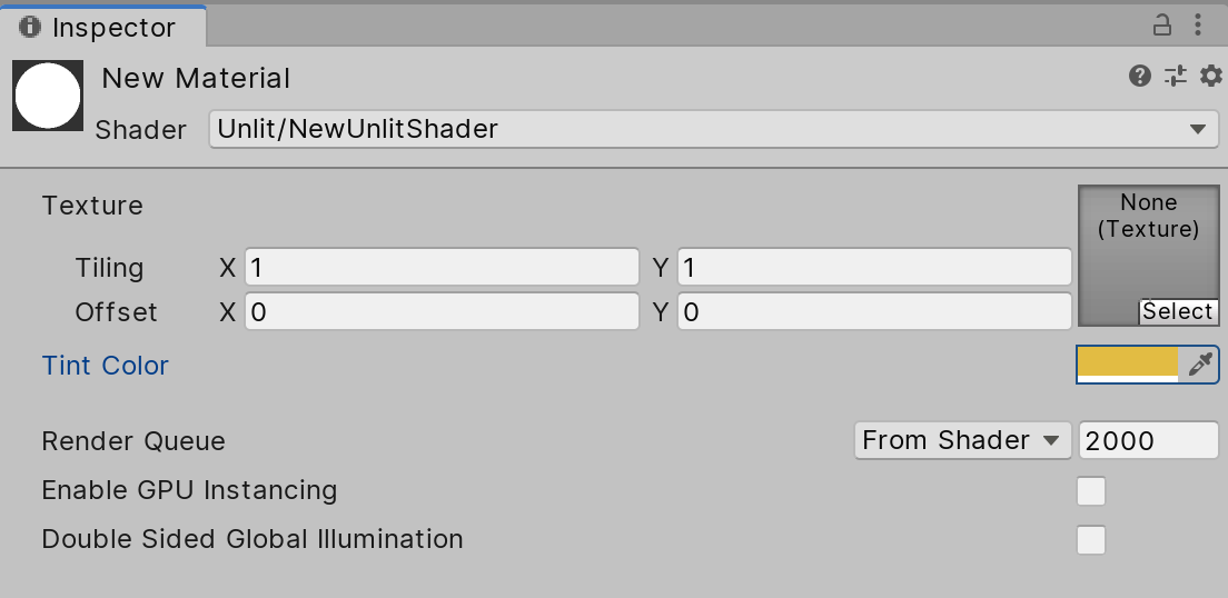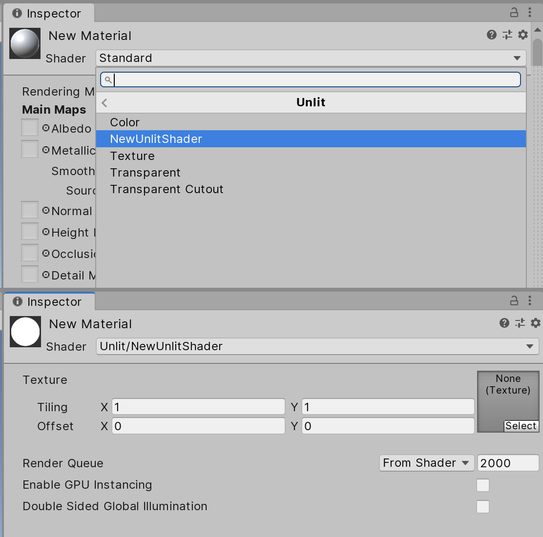 We can access this Shader by creating a Material, then assigning the Shader to it by navigating to Custom > NewUnlitShader in the Shader drop-down.