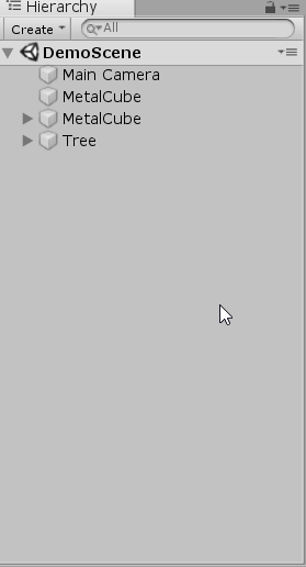 游戏对象可以按父子层级视图结构进行组织。游戏对象可以是其他游戏对象的子对象,这样就可以分组移动游戏对象(如果父对象移动,则其下所有子对象都会随之移动)。Hierarchy 窗口会显示场景中的所有游戏对象,并显示出父/子关系。