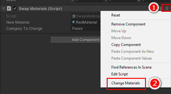 7. Right-click on the script component gear icon and select Change Materials (Figure 06).