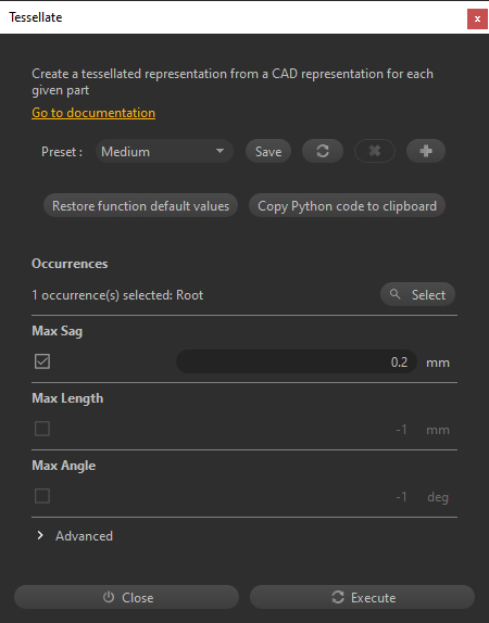 Max Sag: This is the maximum distance between the CAD mesh and the resulting polygonal mesh. The lower this value, the higher the quality of the resulting mesh.