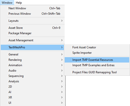 Window > TextMeshPro > Import TMP Essential Resources and