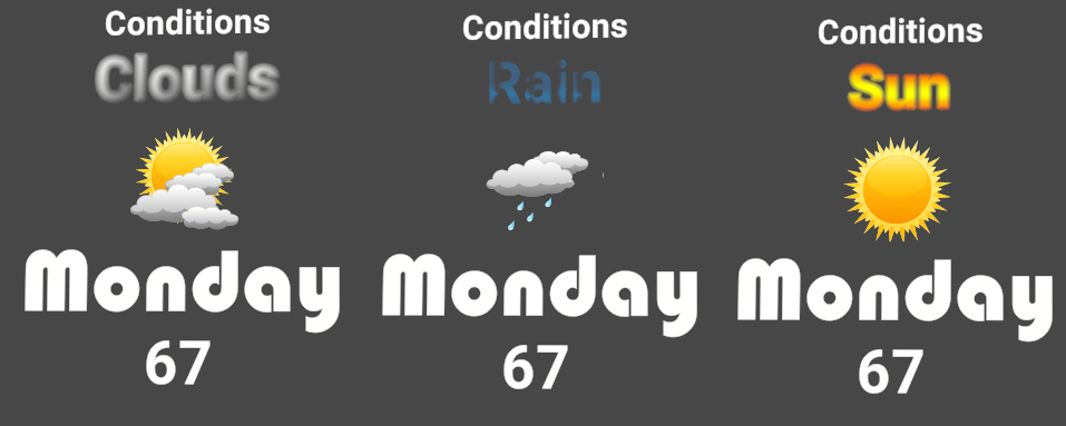 Sprites are good for displaying graphics alongside text. Imagine a weather forecast card, for instance; while it comprises textual elements, such as the temperature and day of the week, the idea of a forecast is predominantly (and much more quickly) defined by images (sun, clouds, rain, etc.). It’s good practice to use Sprites in your UI to communicate a main idea that’s supplemented by text, like the example below.