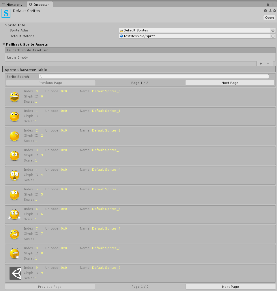 In the Sprite Asset, every Sprite has an Index, Unicode, and Name string. These are needed to reference the Sprite within a TextMesh Pro GameObject.