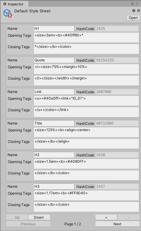 Similar to CSS, TextMesh Pro allows you to group several Tags together to create styles for formatting text.