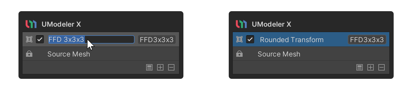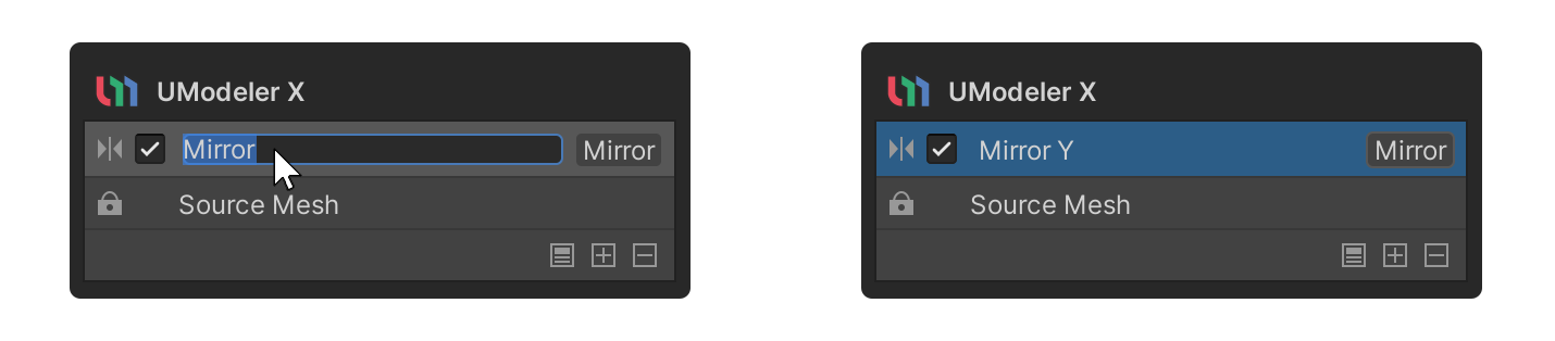To rename a modifier, double-click on the name of the modifier, enter the new name you want to give the modifier, and press Enter. You can also click on any area except the text input area to complete the renaming.