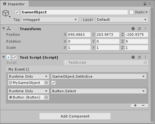 When you define serialized events in code, you will see exposed fields in the Inspector (as outlined in Serialized Fields) . You can drag and drop the GameObjects you want to react to the event into the field(s) in the Inspector.