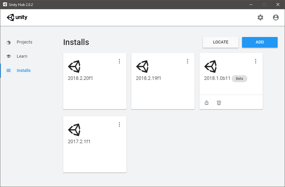Before getting started in Unity, you need to install the right version of the engine for your needs. This can be accomplished via the Unity Hub, a standalone application that streamlines the way you find, download, and manage your Unity Projects and installations. The latest version of Unity can be accessed from the “Installs” page by clicking the “Add” button.