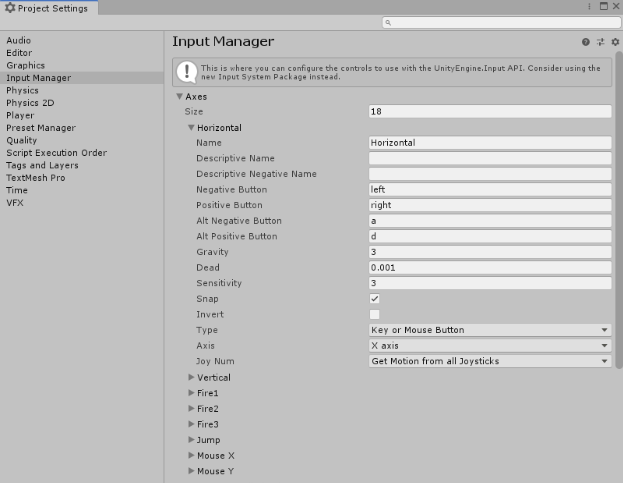Options like deadzone, sensitivity, and inversion can be set per Axis. Although it’s called an Axis, it supports digital inputs as well, using the Input.GetButtonDown() function. You can also query explicit keys using Input.GetKeyDown().