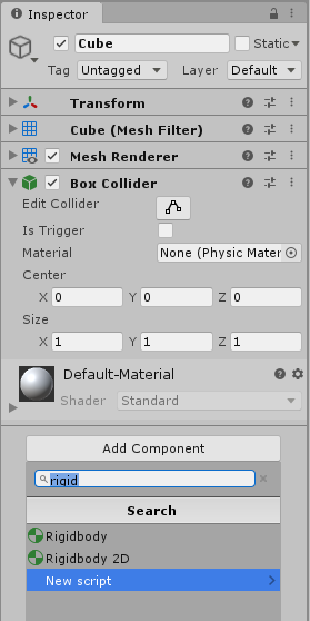 Clicking the Add Component button brings up a search widget which you can use to find the component you want to add. You can also select the New Script button from here to immediately create a new component script and add it to the GameObject.
