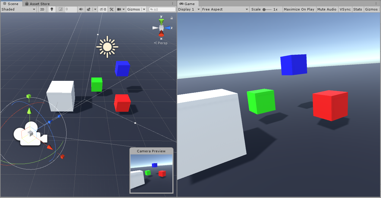 Unity separates these two “modes” into the Scene and Game views respectively. The Game view captures the cursor and responds to inputs just like a game build. Switching to the Scene view allows for updates at runtime, and it’s common to lay them out side-by-side to allow for rapid iteration.