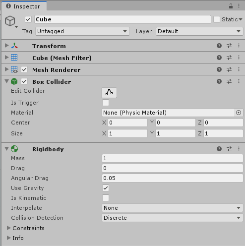 Unity’s built-in physics engines control physical simulation using the Rigidbody component and Collider component. There are specialized Colliders depending on the GameObject shape, including: