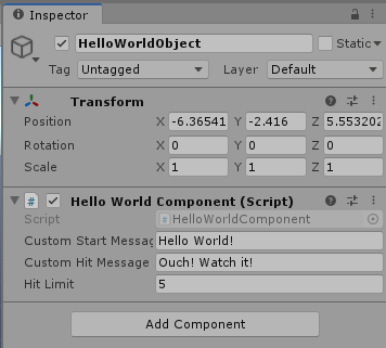 Components can be added to GameObjects either via the Component menu in the menu bar or by selecting the Add Component button in the Inspector.