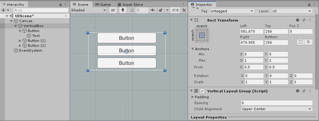 Adding behavior to this UI is accomplished with C# scripting, or by dragging and dropping UnityEvents in the Inspector (for components like Button).
