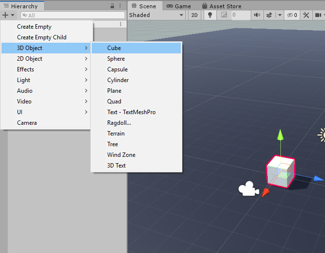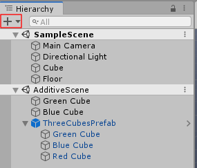 GameObjects can be created via the “GameObject” menu in the menu bar, or by clicking the plus button (+) at the top of the Hierarchy window. This instantiates the selected GameObject into the Scene. It can then be moved around or attached to other GameObjects.
