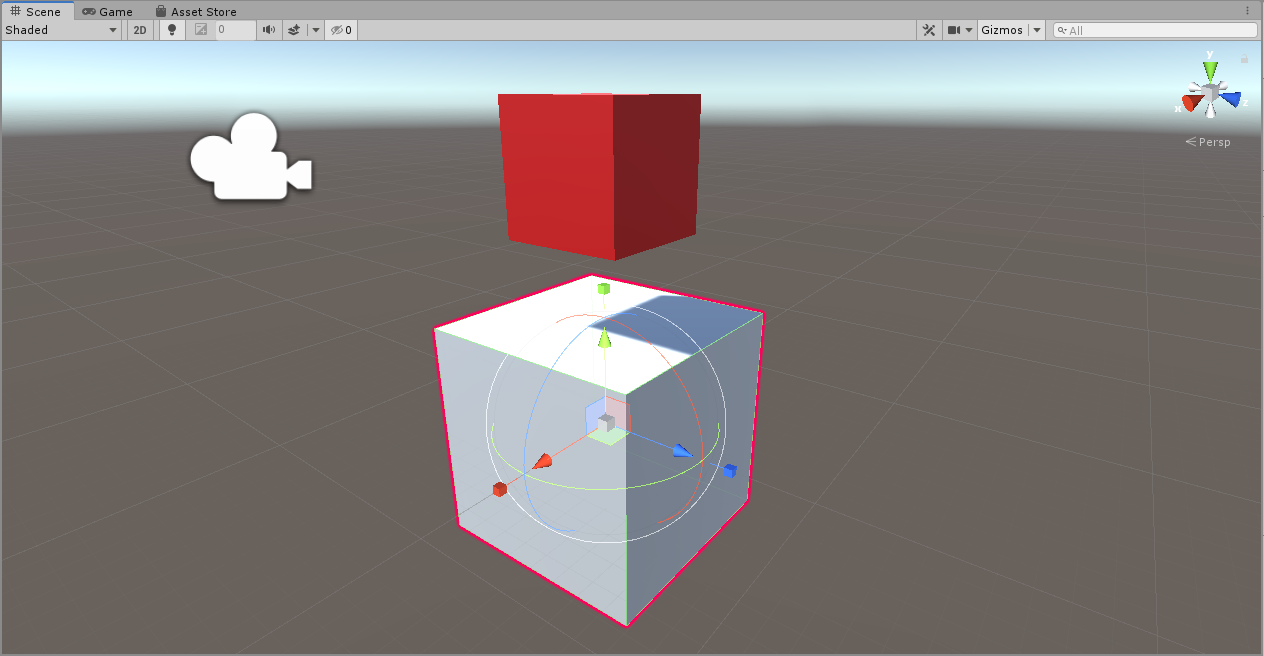 The Scene Gizmo, located in the upper right of the Scene view, represents the view’s orientation. Clicking an axis aligns the view to that axis, and clicking the cube in the center swaps between orthographic and perspective views.