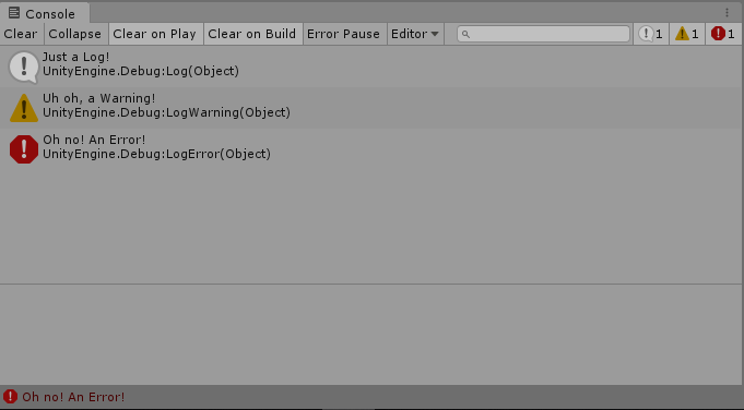 In the top menu bar of the Console, you can clear or filter these messages, and enable “Pause on Error” functionality. The debug functions also have a Context argument, which allows you to associate a GameObject to the message. When a message with a Context is double clicked, the GameObject is focused in the scene view and hierarchy.