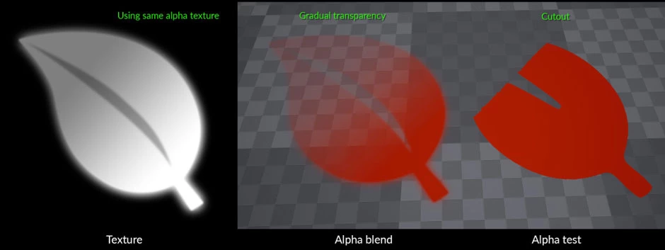 Alpha blend allows partial transparency while alpha test results in a sharp cutout. A comparison of alpha blend and alpha test can be seen in the following image: