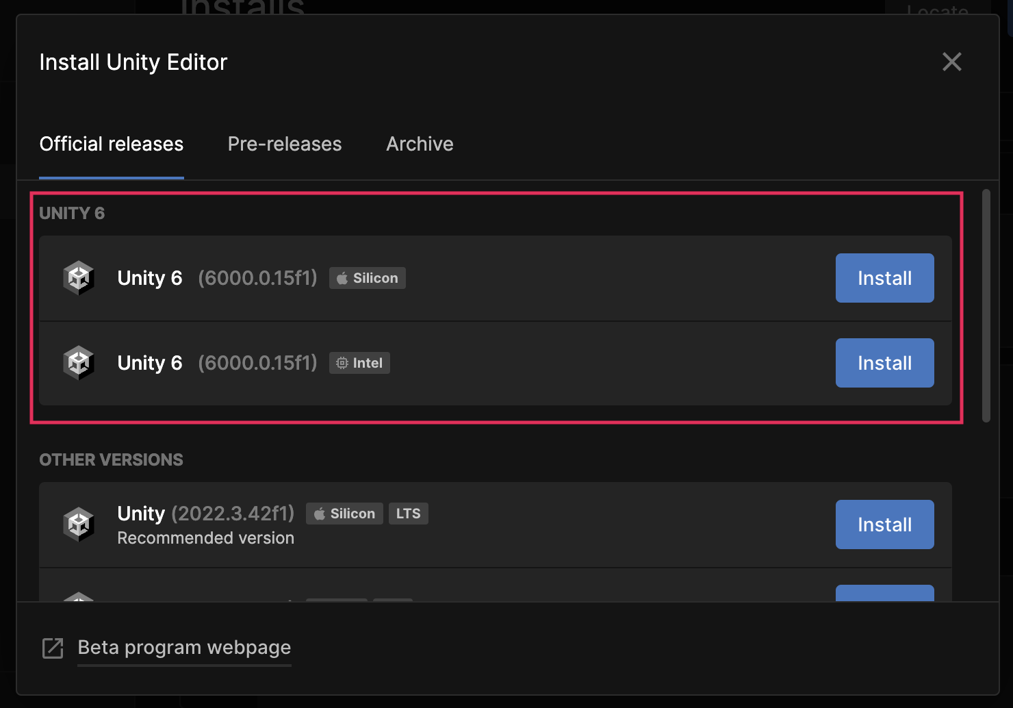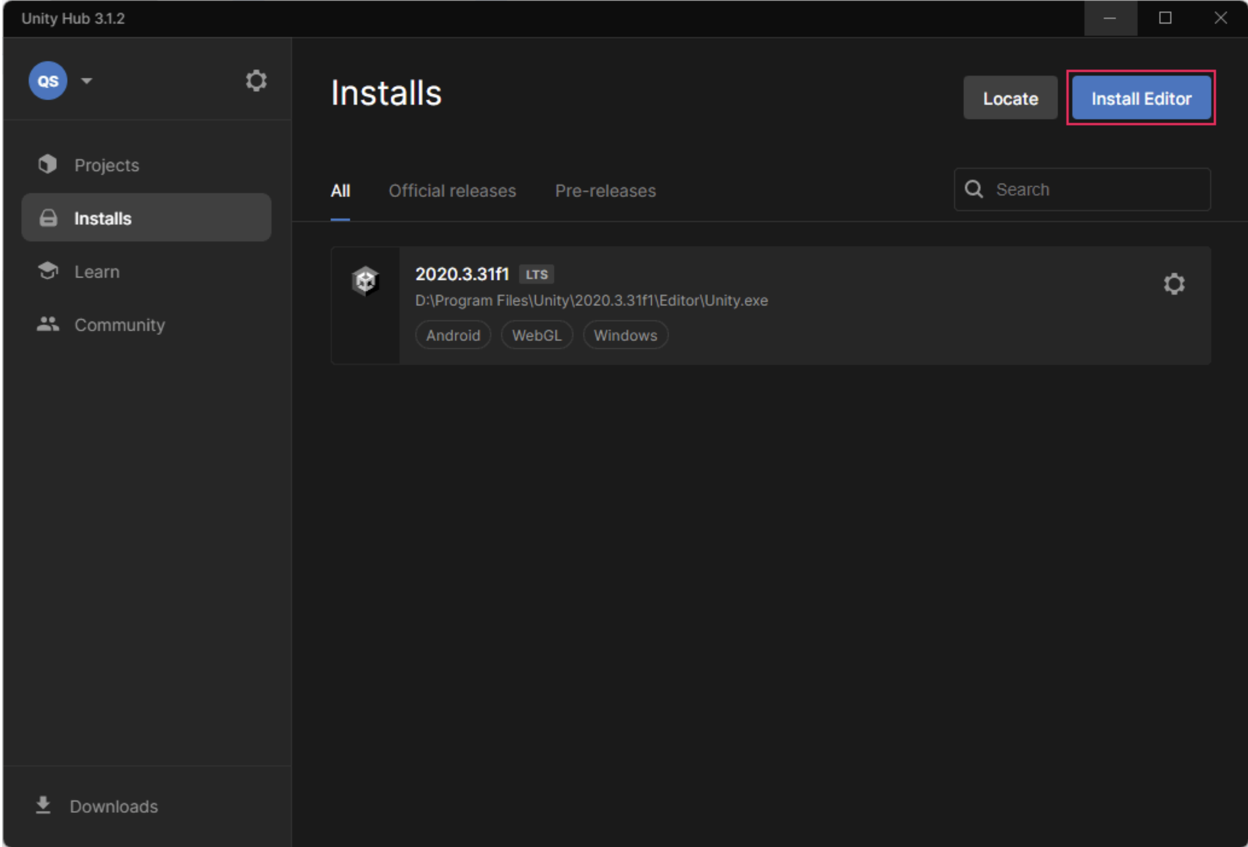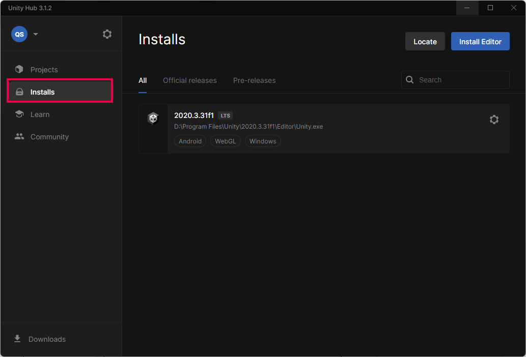 When the process is complete, this version of the Unity Editor will appear on the Installs tab of the Unity Hub.